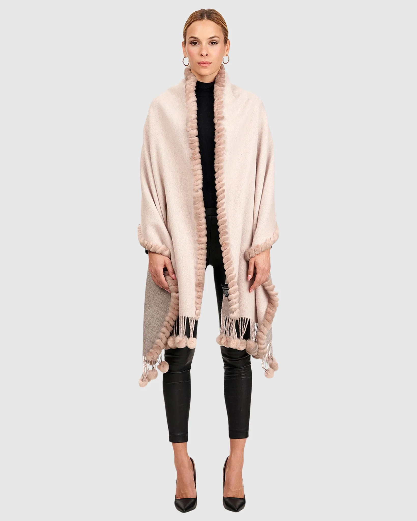 Our cashmere and wool stole, accented with a rex rabbit trim and playful side pompoms, effortlessly enhances any ensemble.Â