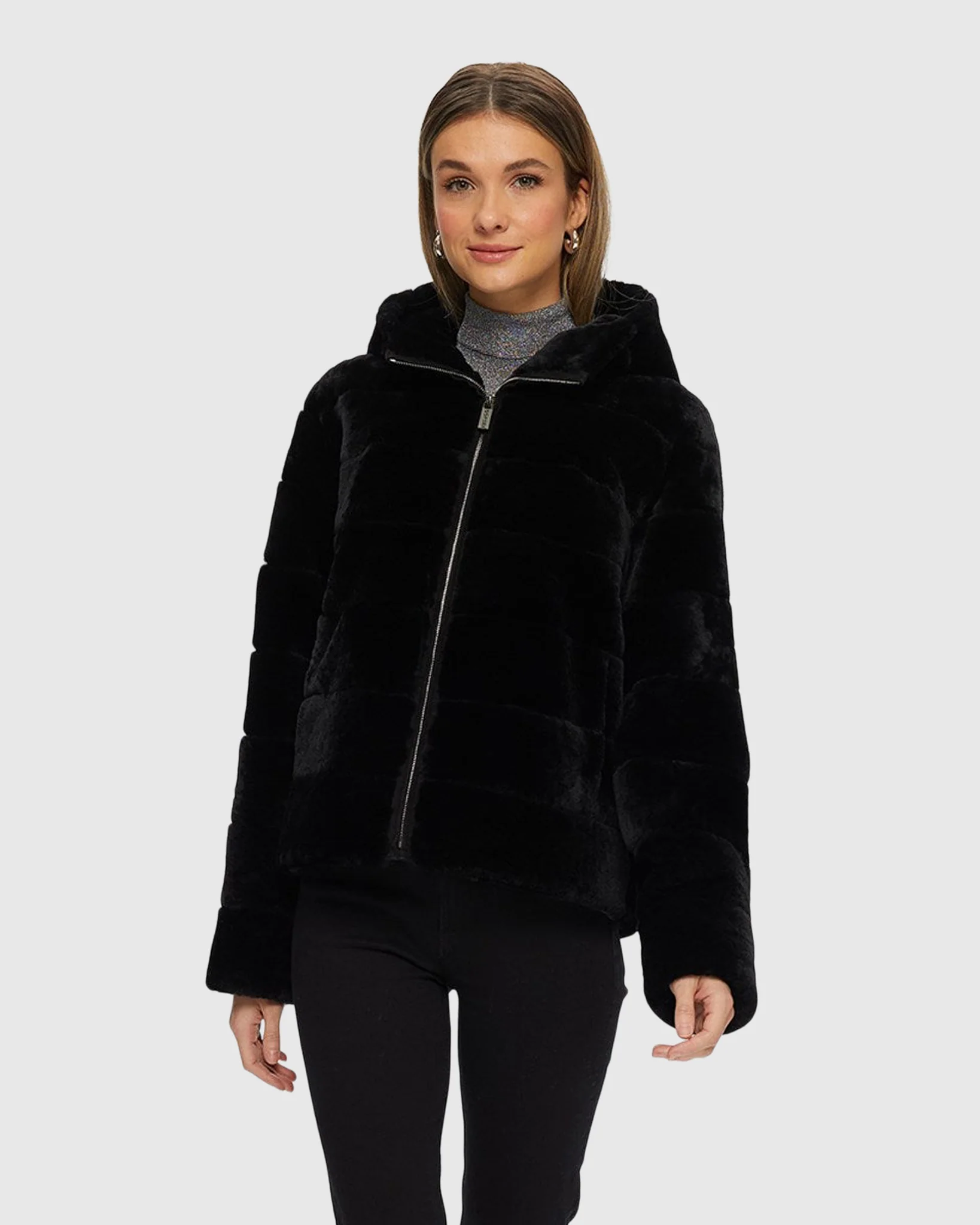 Stay warm and comfortable with this shearling lamb jacket featuring a hood and zip closure. Ideal for cold days, it combines cozy insulation with easy wear.