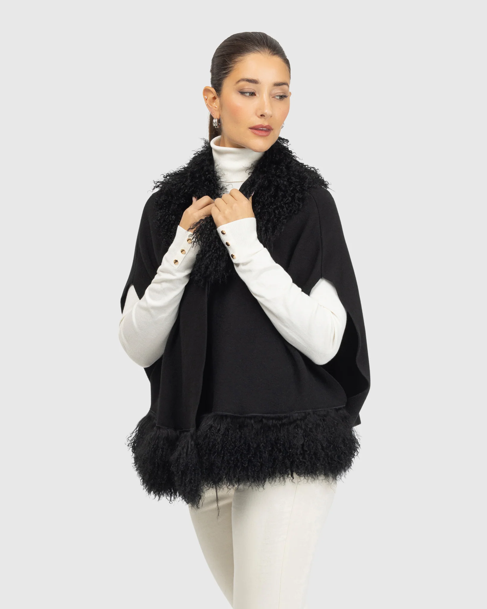 Elevate your wardrobe with this Knit Vest featuring luxurious Mongolian shearling lamb trim. Ideal for cooler days, it combines timeless craftsmanship with modern appeal to keep you looking effortlessly chic.