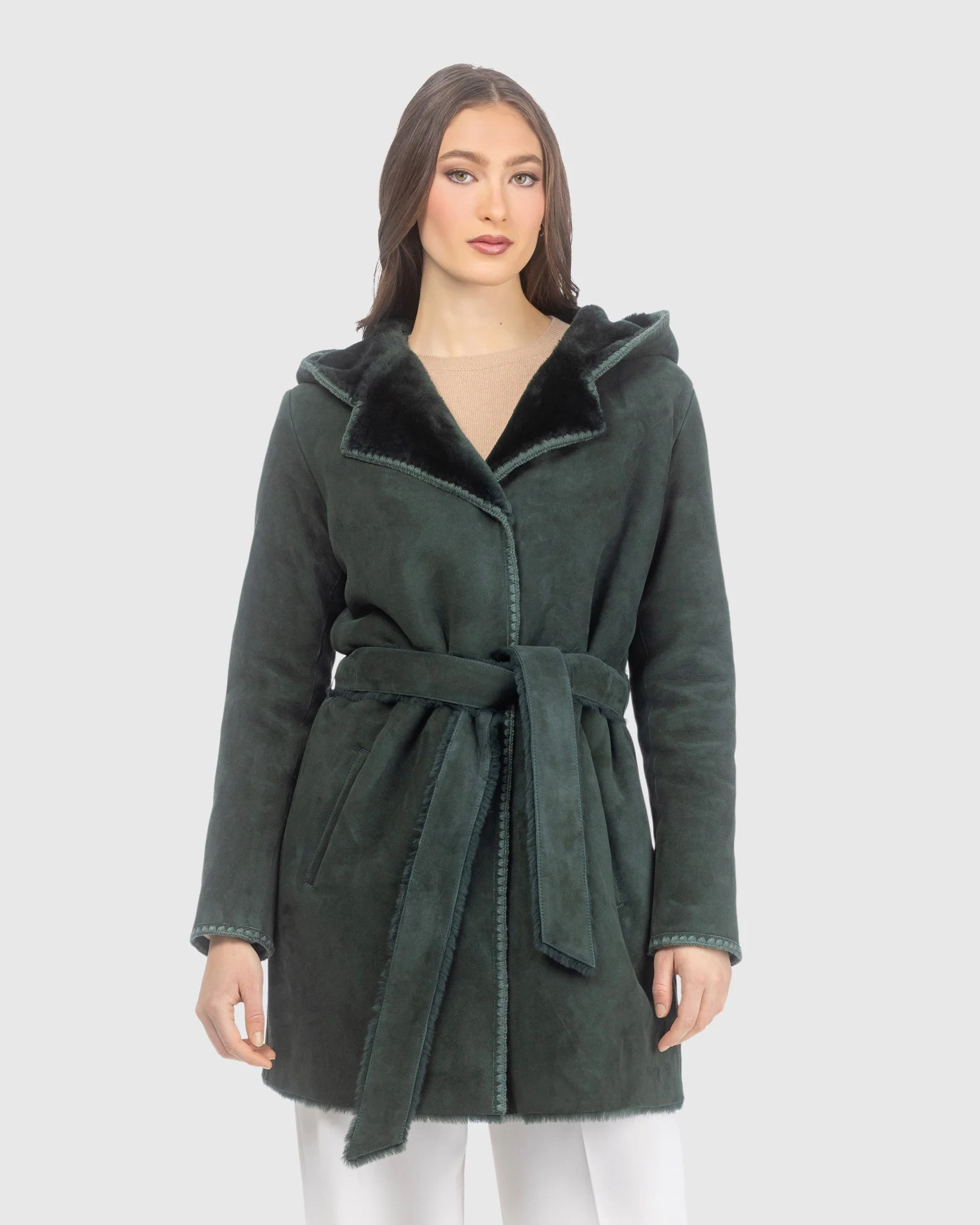 Immerse yourself in artistry with this Merino Shearling Lamb Parka, featuring exquisite embroidered trim and a waist-defining belt. This piece blends artisanal detail with supreme cold-weather protection, creating a luxurious silhouette that is both functional and timeless.