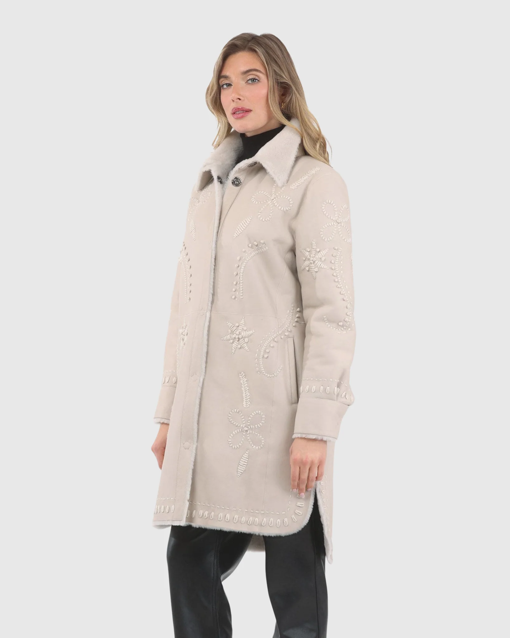This luxurious embroidered shearling coat combines warmth and style, crafted from premium materials to keep you comfortable and elegant in any setting.