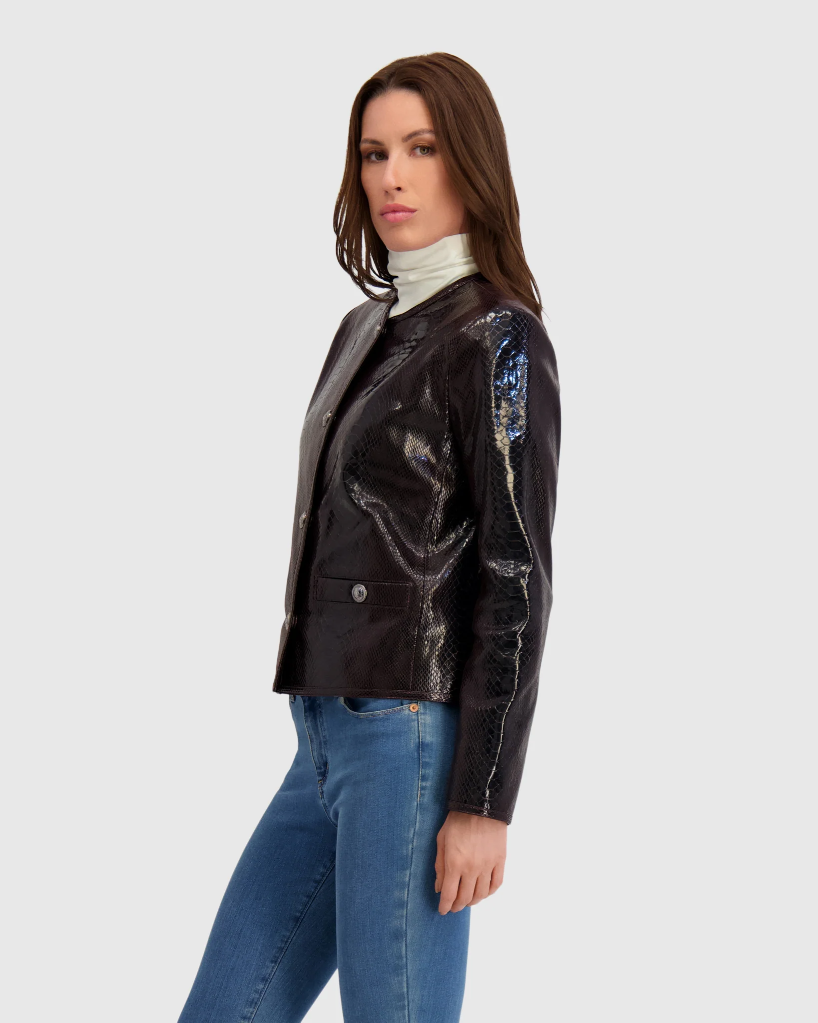 Elevate your style with the Metis Suede Python Printed Jacket, a bold blend of luxury and edge.Â