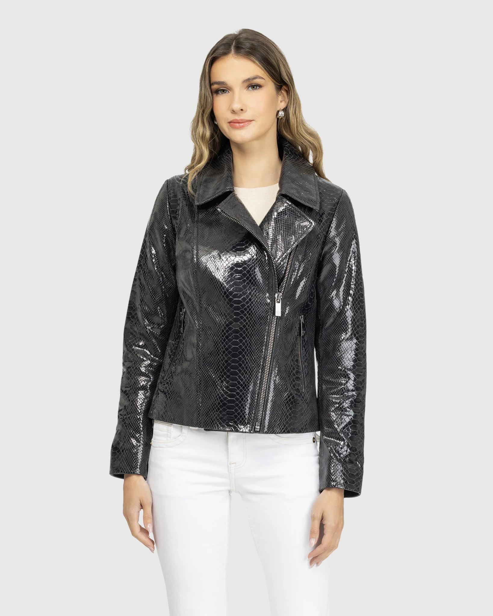 Elevate your style with the Metis Suede Python Printed Moto Zip Jacket. Crafted from soft suede, this jacket features a striking python print that adds an edgy, sophisticated touch to any outfit.Â