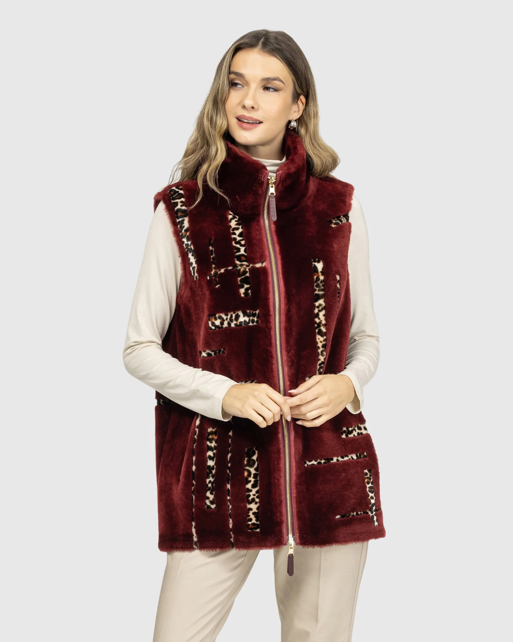 This Reversible Shearling Lamb Vest combines warmth and style effortlessly. The LPRD intarsia detail adds a subtle, distinctive touch, making it a cozy yet fashionable choice for layering.Â