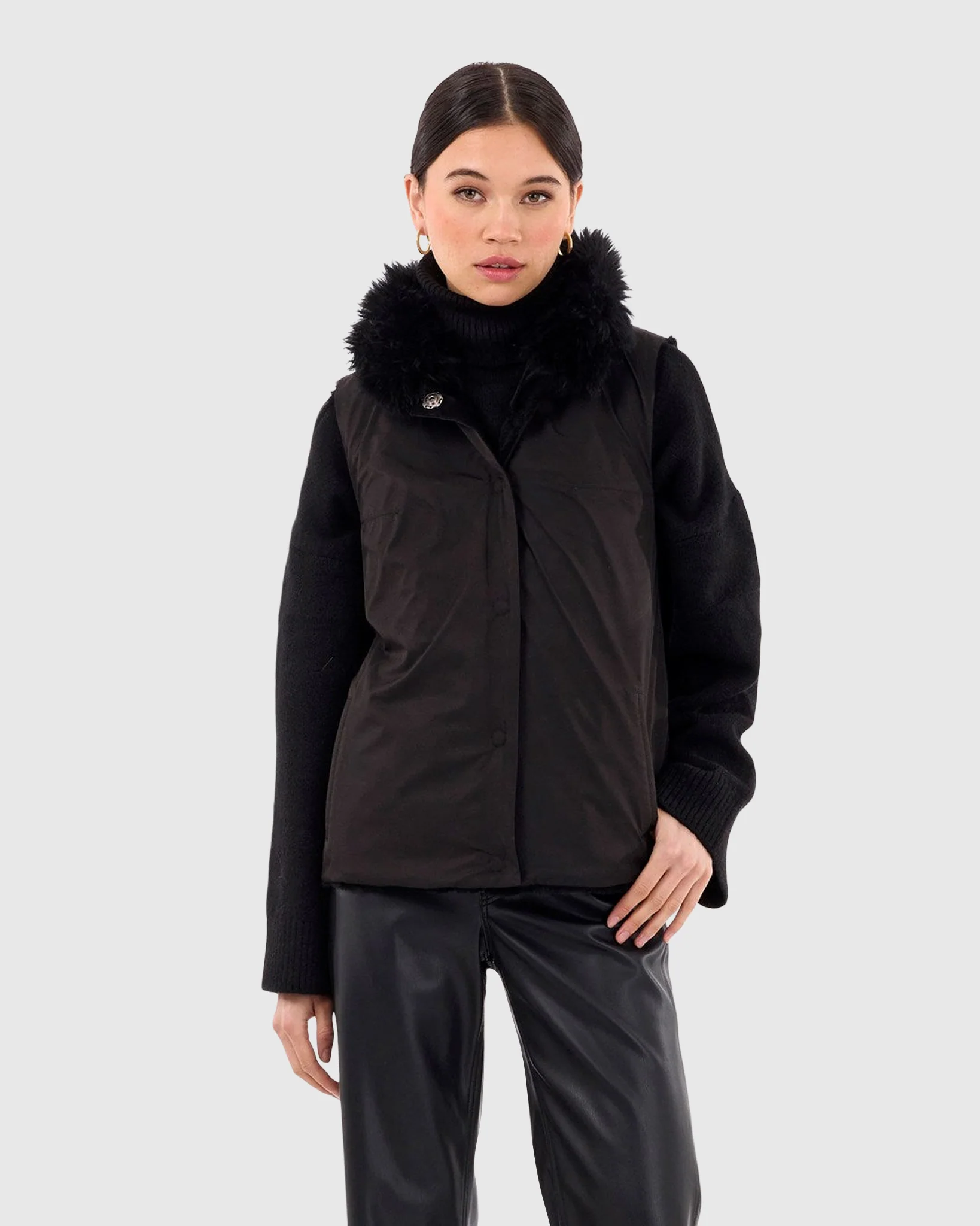 Elevate your outerwear with this reversible shearling lamb vest, crafted for both warmth and style. Featuring a select cashmere goat collar, it offers luxurious softness and a sophisticated touch.Â
