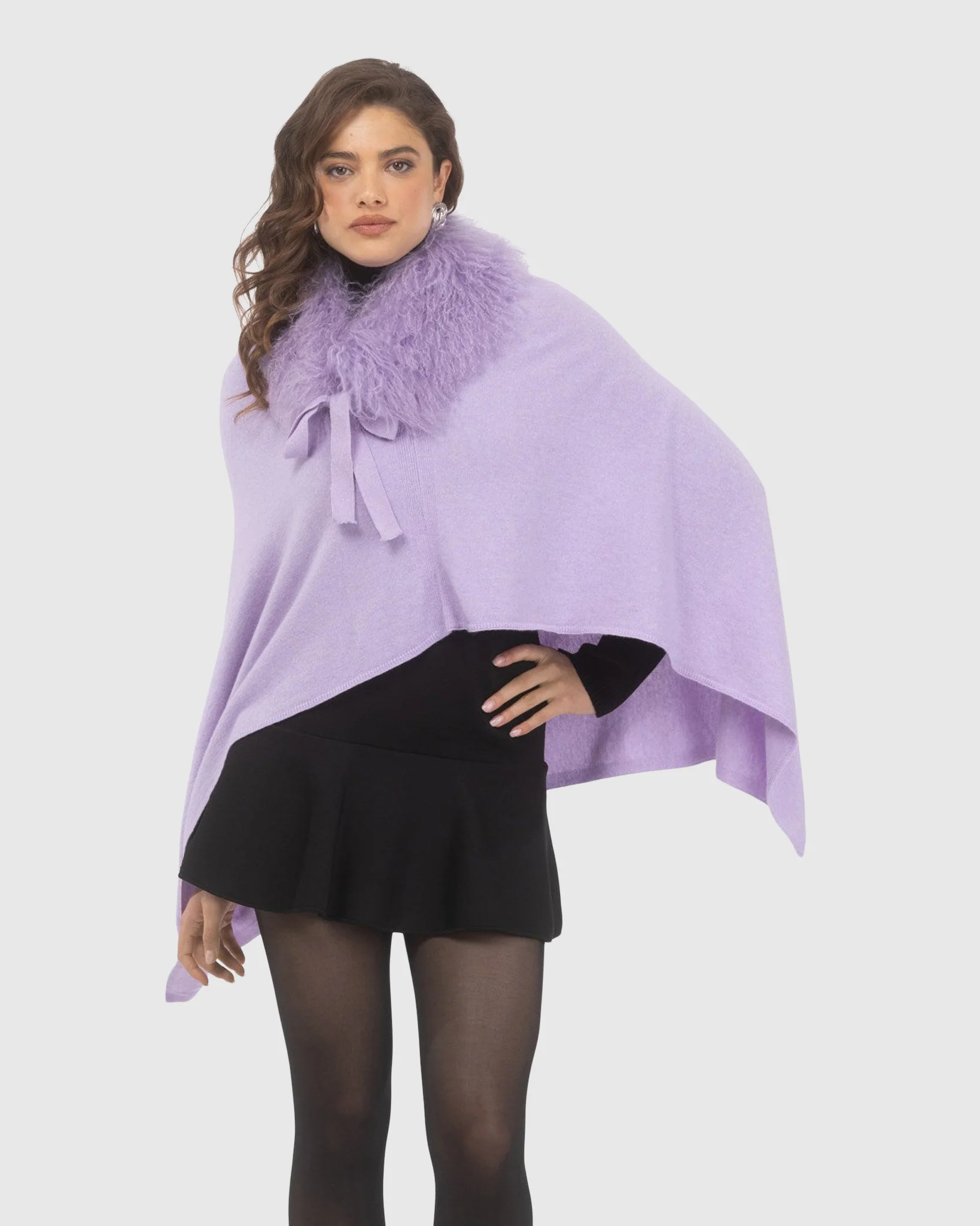 Make a grand entrance in this Select Cashmere and Merino Blend Poncho, featuring a dramatic Mongolian lamb collar. Its fluid silhouette and rich textures provide a look of effortless sophistication. This poncho is a standout piece for those who demand luxury and unique style.