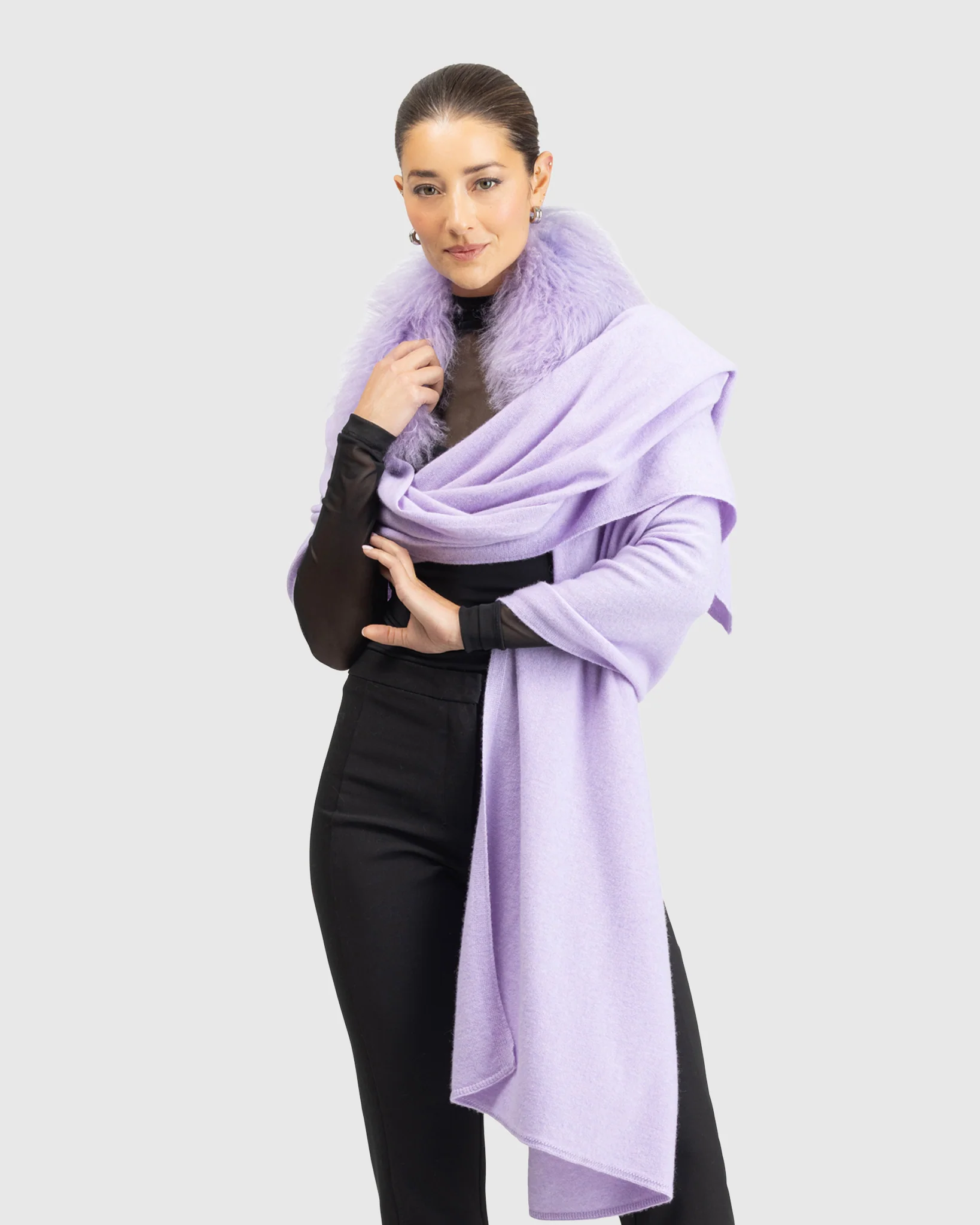 This stole combines soft cashmere and merino wool with elegant Mongolian lamb trim, providing warmth and style for any occasion.